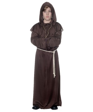 Brown Monk Child Robe Costume includes robe with wide collar and attached hood and white rope belt. Excludes other accessories. Available in sizes small, medium, and large. Great for a monk character cosplay!