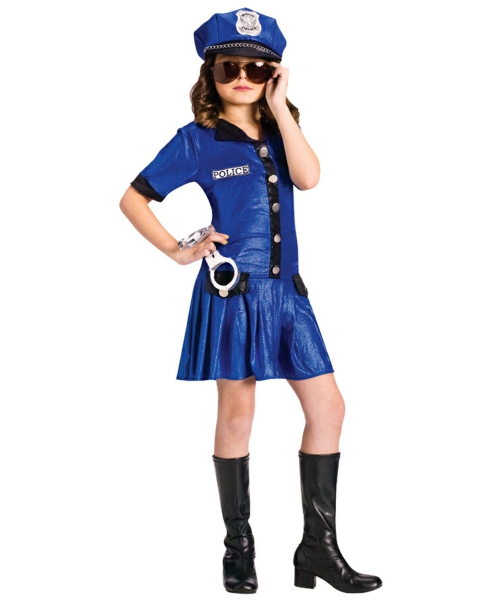 Police Chief Costume includes a black and blue logo hat. Please note, sunglasses, handcuffs, and boots are not included.This Police Girl Costume is available in Child size Small (4-6), Medium (8-10) and Large (12-14). Made of Polyester. Care instructions: Hand wash. Do not iron.