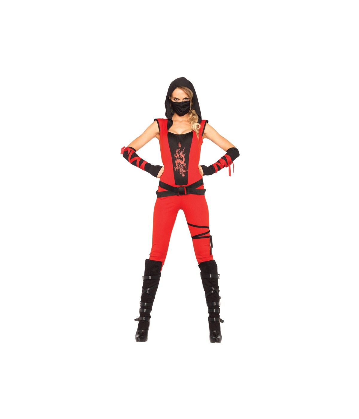 Sneaky, fun, and Sexy, this Ninja Costume for Women is a top choice for Halloween. The undeniably Sexy Costume includes a catsuit with hood and leg wrap, a two-strapped belt, arm warmers with crisscrossing wrap, and a mask that covers the mouth and nose.