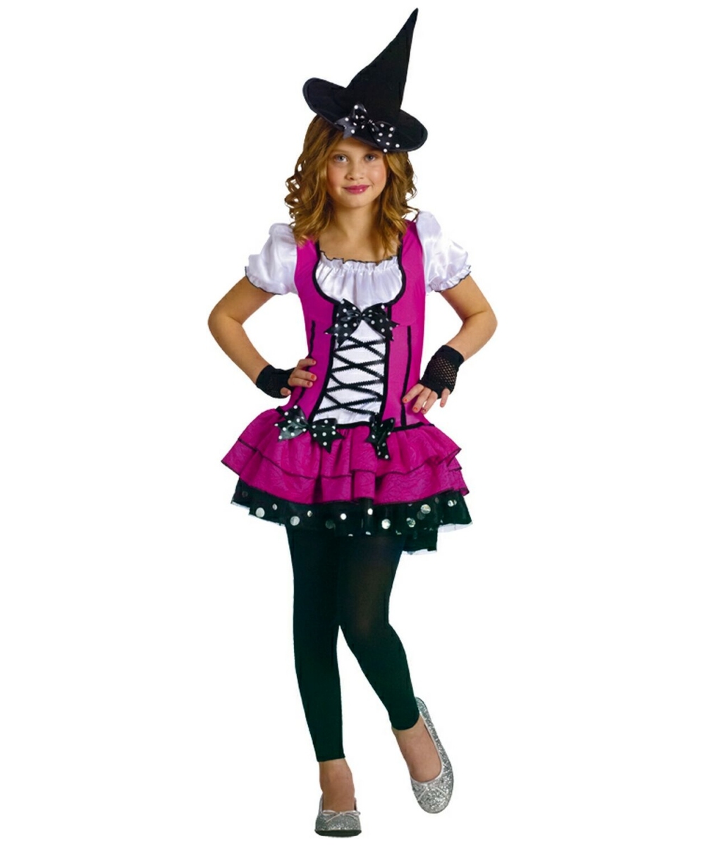 Sugar and Spice Witch Costume includes black witch hat with polka dot bow accent. Please note does not include glovelettes, leggings or shoes. This Witch Costume is available in Child size Small (4-6), Medium (8-10) and Large (12-14). Made of Polyester. Care instructions: Hand wash. Do not iron.